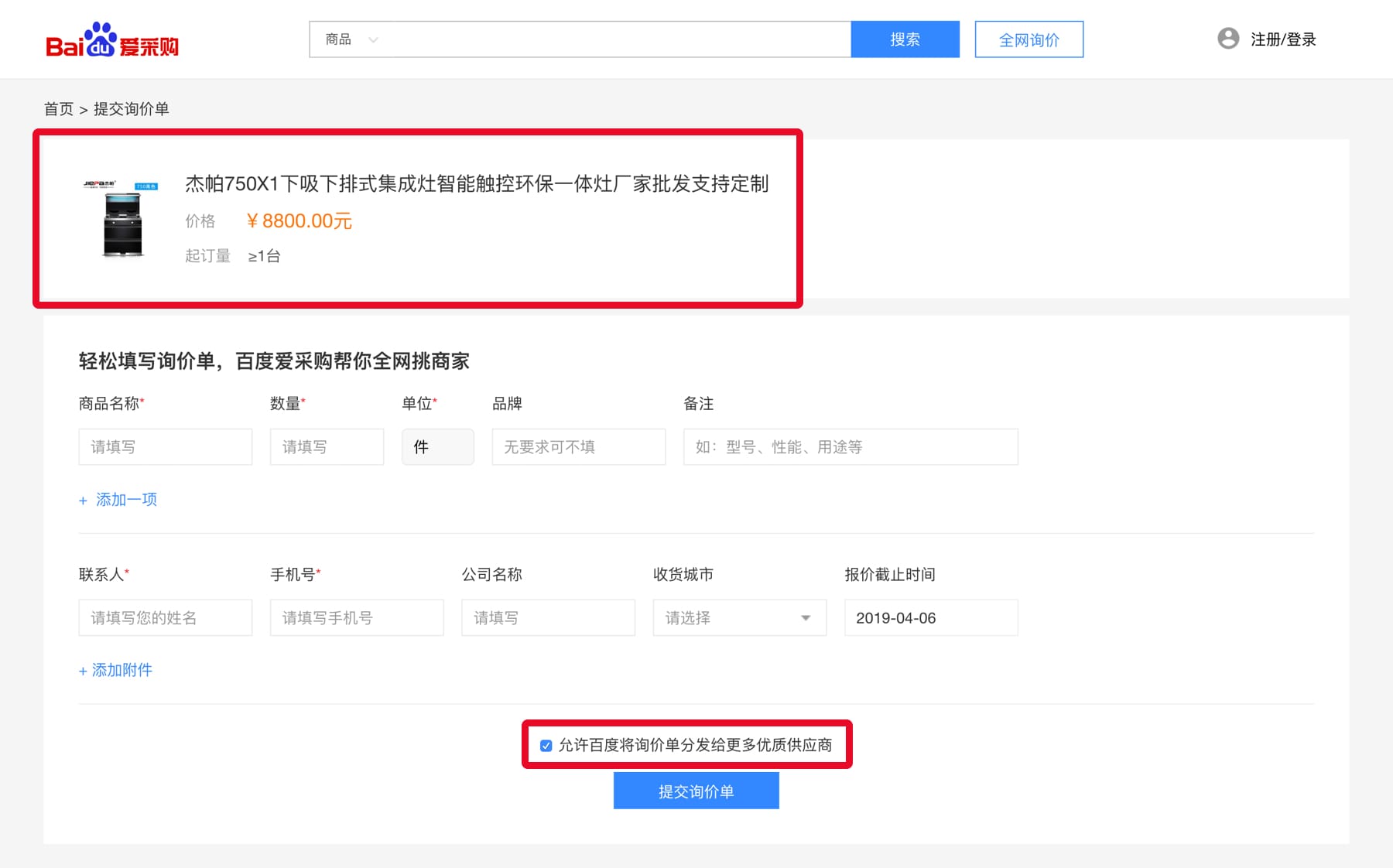操作也非常便捷,买家只需要点击商品详情页上的【立即询价】填写询价单即可;买家甚至可选择红框中选项,决定是否将此次询价单信息发送给更多商家,获得更多报价进行对比。