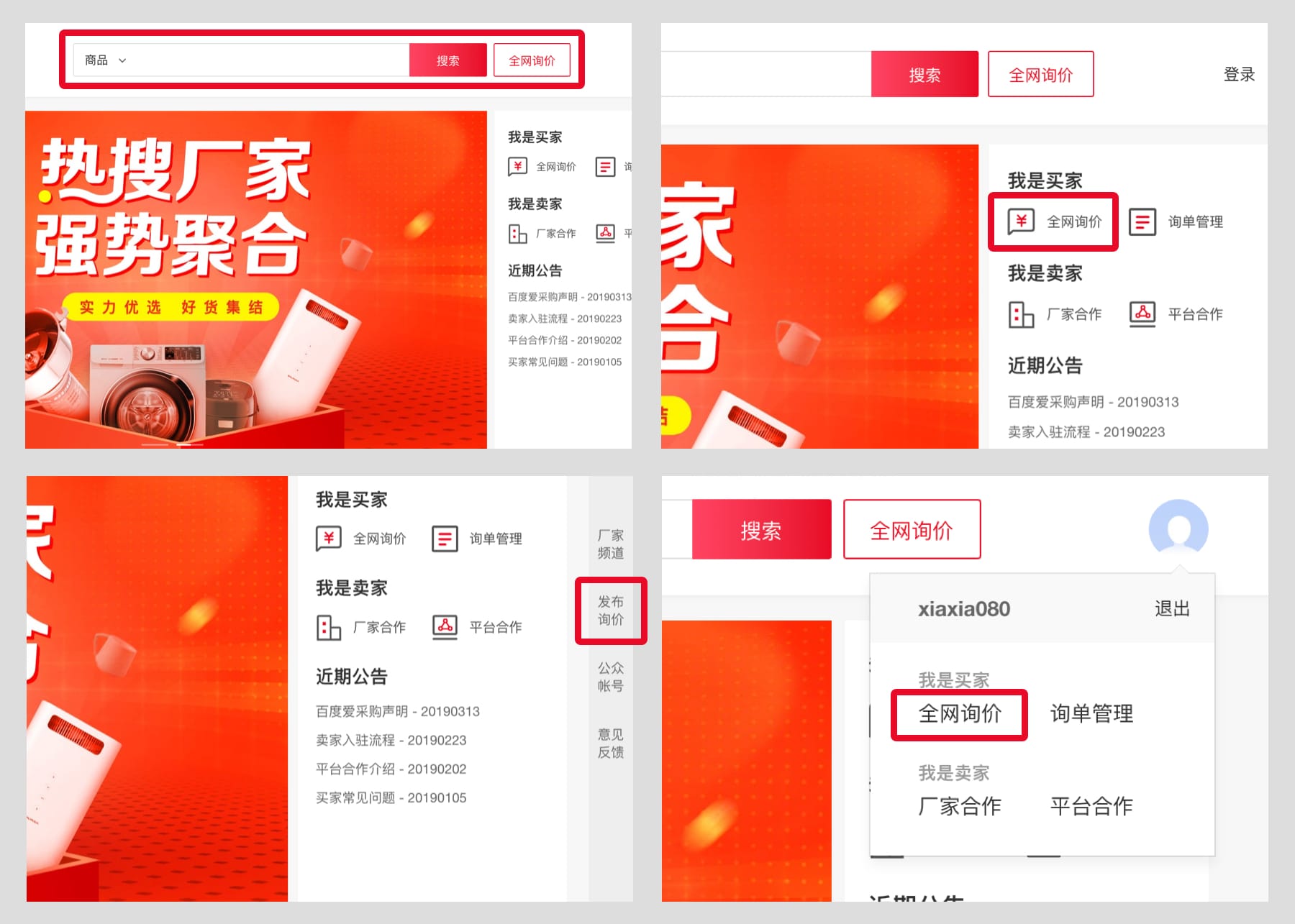 针对于询价功能,百度爱采购平台支持买家进行全网询价和指定询价。