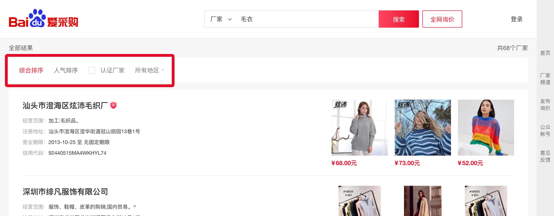 在搜索结果中,可使用热门排序和地域筛选功能,方便快速掌握厂家情况;