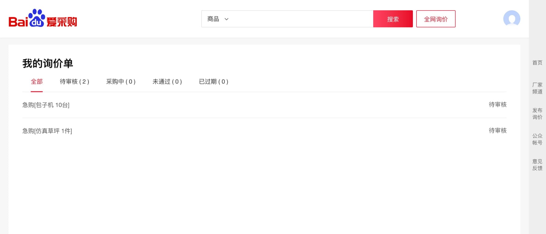 百度爱采购平台有4处【全网询价】按钮,点击其中任意一个都可进入询价单填写页面;完成采购信息填写并通过审核后,即可在【我的询价单】中查看相关厂商的报价。